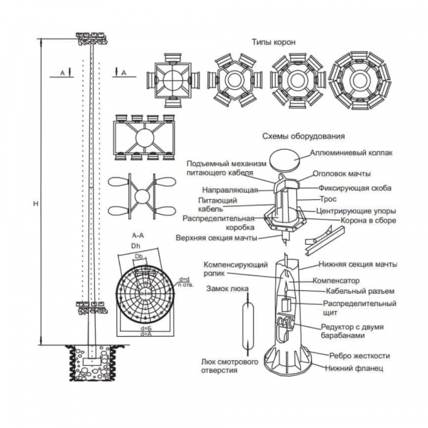 ВГМ-16 конструкции, выполняемые из листового проката с применением современных методов автоматической сварки, позволяющих получить максимально надежный сварной шов. При этом металлоконструкция имеет минимум точек напряжения, что позволяет ей сохранять вертикальное положение в различных условиях. Важным конструкционным элементом системы является мобильная корона, устройство которой позволяет отказаться от больших затрат на обслуживание сложных высокомачтовых опор и значительно расширить географию их применения.
